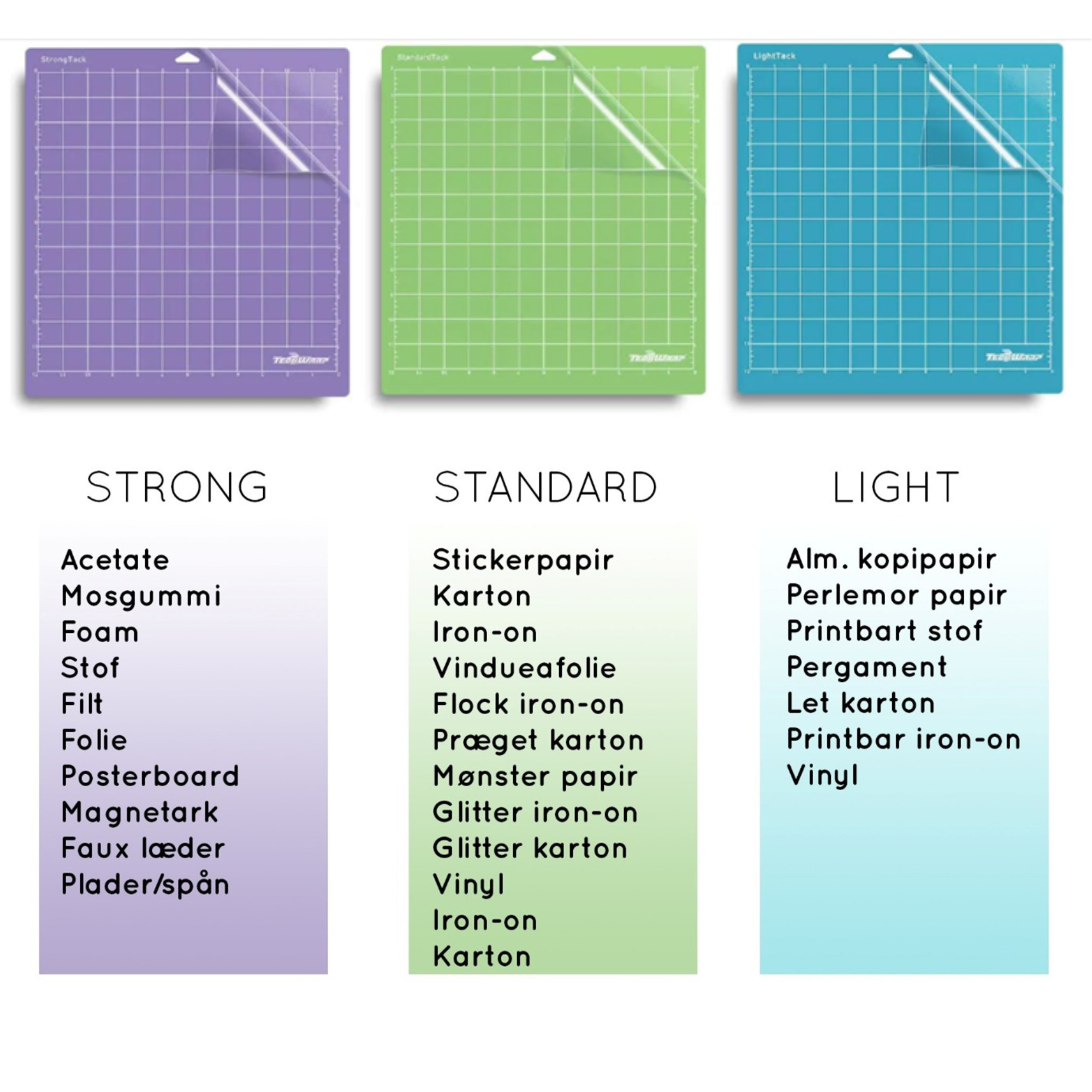 Teckwrap har lavet en visuel guide, så du kan se hvilken måtte der anbefales til dét materiale som du skal til at skære.
